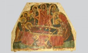 Τμήμα σκηνής της Κοίμησης Θεοτόκου, από τοιχογραφίες που βρίσκονταν στον δυτικό τοίχο του καθολικού της ομώνυμης Μονής στους Δελφούς,...