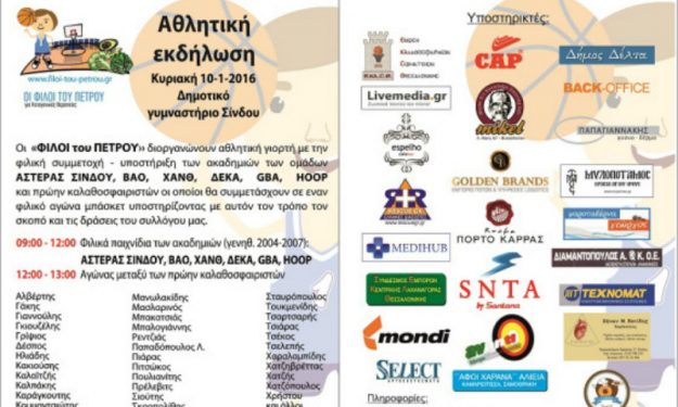 Το μη κερδοσκοπικό σωματείο κοινωνικού χαρακτήρα με την επωνυμία «ΟΙ ΦΙΛΟΙ ΤΟΥ ΠΕΤΡΟΥ», με σκοπό την παροχή κάθε δυνατής επιστημονικής, κοινωνικής, οικονομικής και ηθικής συμπαράστασης προς τα παιδιά που παρουσιάζουν επιληπτικές κρίσεις ή πάσχουν από νευρολογικές παθήσεις και τις οικογένειές τους, σας καλεί στην αθλητική γιορτή του συλλόγου που θα πραγματοποιηθεί με την φιλική συμμετοχή-υποστήριξη των ακαδημιών των ομάδων ΑΣΤΕΡΑΣ ΣΙΝΔΟΥ, ΒΑΟ, ΧΑΝΘ, ΔΕΚΑ, GBA , HOOP ΚΑΙ ΠΡΩΗΝ ΚΑΛΑΘΟΣΦΑΙΡΙΣΤΏΝ οι οποίοι θα συμμετάσχουν σε εναν φιλικό αγώνα μπάσκετ υποστηρίζοντας με αυτόν τον τρόπο τον σκοπό και τις δράσεις του συλλόγου μας. Σκοπός της εκδήλωσης είναι η γνωριμία κάθε ενδιαφερόμενου με το σύλλογο και τους σκοπούς του και ιδιαίτερα με την προώθηση της κετογονικής θεραπείας, ως εναλλακτικό μέσο βελτίωσης ή και εξάλειψης της φαρμακοανθεκτικής επιληψίας σε παιδιά.