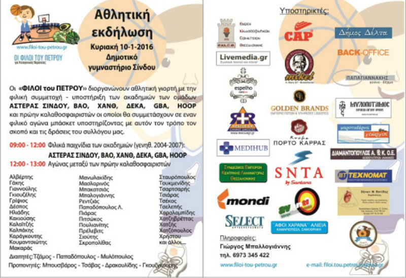 Το μη κερδοσκοπικό σωματείο κοινωνικού χαρακτήρα με την επωνυμία «ΟΙ ΦΙΛΟΙ ΤΟΥ ΠΕΤΡΟΥ», με σκοπό την παροχή κάθε δυνατής επιστημονικής, κοινωνικής, οικονομικής και ηθικής συμπαράστασης προς τα παιδιά που παρουσιάζουν επιληπτικές κρίσεις ή πάσχουν από νευρολογικές παθήσεις και τις οικογένειές τους, σας καλεί στην αθλητική γιορτή του συλλόγου που θα πραγματοποιηθεί με την φιλική συμμετοχή-υποστήριξη των ακαδημιών των ομάδων ΑΣΤΕΡΑΣ ΣΙΝΔΟΥ, ΒΑΟ, ΧΑΝΘ, ΔΕΚΑ, GBA , HOOP ΚΑΙ ΠΡΩΗΝ ΚΑΛΑΘΟΣΦΑΙΡΙΣΤΏΝ οι οποίοι θα συμμετάσχουν σε εναν φιλικό αγώνα μπάσκετ υποστηρίζοντας με αυτόν τον τρόπο τον σκοπό και τις δράσεις του συλλόγου μας. Σκοπός της εκδήλωσης είναι η γνωριμία κάθε ενδιαφερόμενου με το σύλλογο και τους σκοπούς του και ιδιαίτερα με την προώθηση της κετογονικής θεραπείας, ως εναλλακτικό μέσο βελτίωσης ή και εξάλειψης της φαρμακοανθεκτικής επιληψίας σε παιδιά.