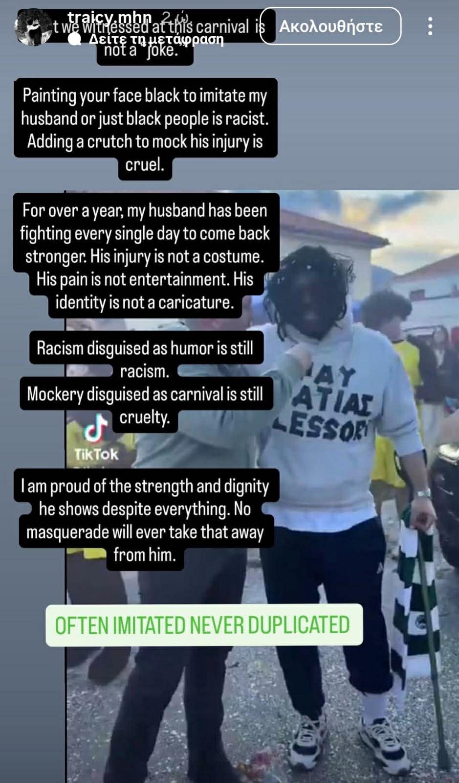 Για περισσότερο από έναν χρόνο, ο σύζυγός μου, παλεύει κάθε ημέρα για να επιστρέψει πιο δυνατός. Ο τραυματισμός του, δεν είναι στολή. Ο πόνος του, δεν είναι ψυχαγωγία. Η ταυτότητά του, δεν είναι μια καρικατούρα.
