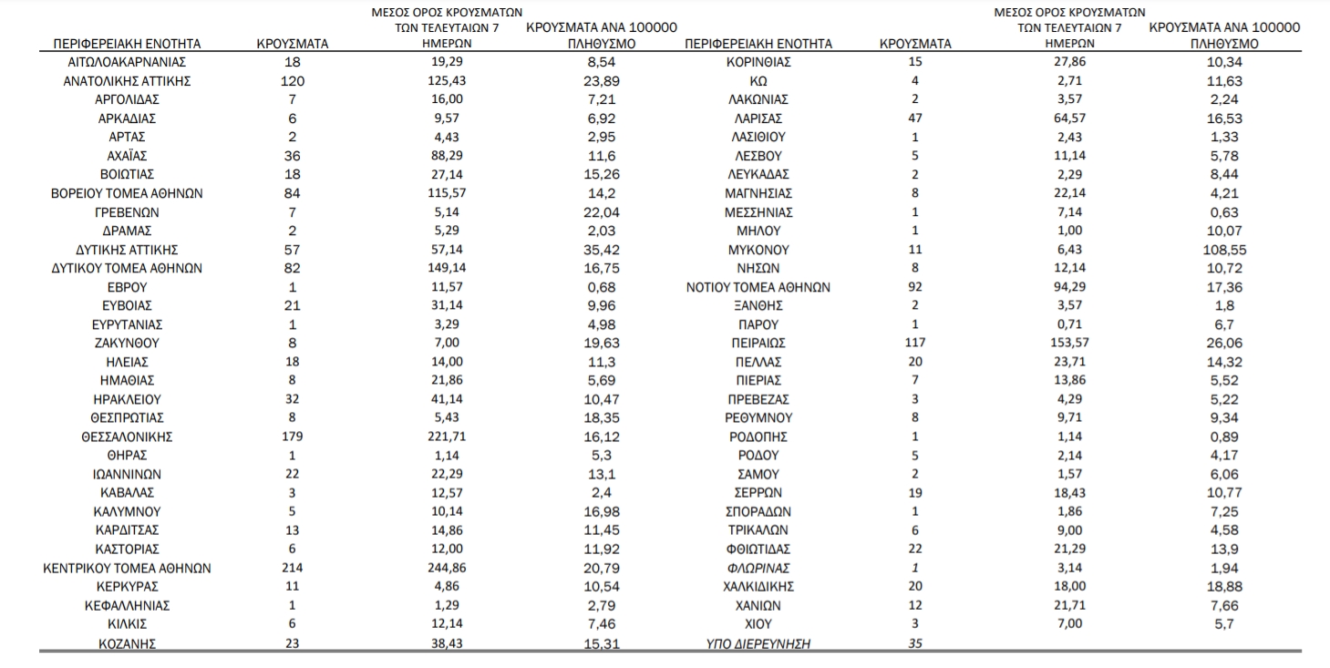 Από το σύνολο των 1.514 νέων κρουσμάτων του νέου ιού στη χώρα 12 είναι εισαγόμενα εκ των οποίων 9 εντοπίστηκαν κατόπιν ελέγχων στις πύλες εισόδου της χώρας. Η κατανομή των 1.502 νέων εγχώριων κρουσμάτων ανά Περιφερειακή Ενότητα παρουσιάζεται στον κατωτέρω πίνακα.