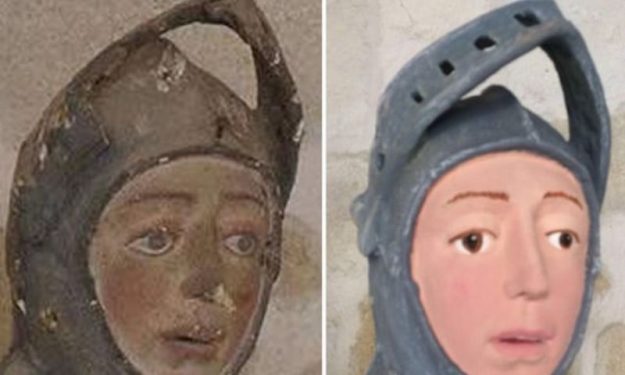 De nuevo en España se vuelve a destrozar una obra de arte. Esta imagen es de San Jorge y del siglo XVI de San Miguel de Estella (Navarra). Curioso que los jefes contraten a semejantes restauradores, a lo mejor se tendrían que restaurar los jefes que los contratan ¿No? pic.twitter.com/G9iyLidgPr