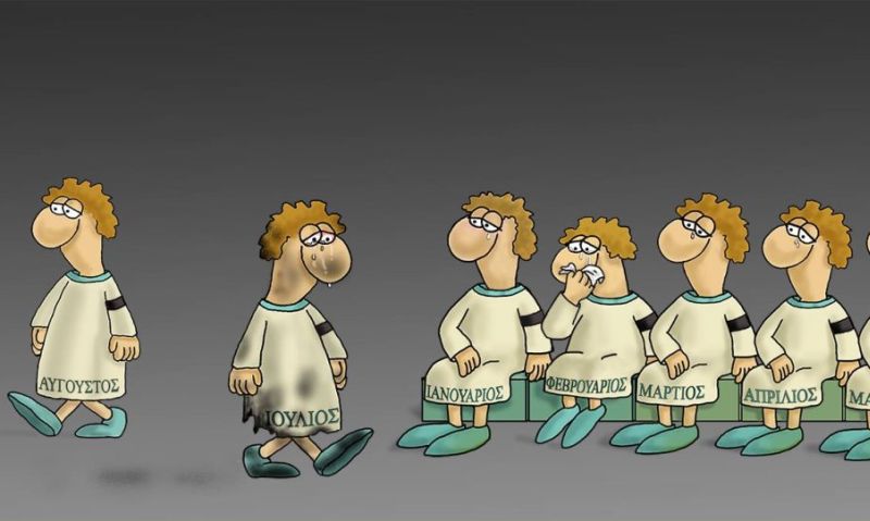Αυτή τη φορά, ο σκιτσογράφος αποχαιρετά τον μήνα Ιούλιο που δίνει τη θέση του στον Αύγουστο.