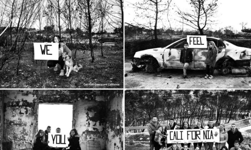 Οι νέοι από το Μάτι, τον Νέο Βουτζά και όλες τις πυρόπληκτες περιοχές της Αττικής με ένα κολλάζ τεσσάρων ασπρόμαυρων φωτογραφιών που η κάθε μία έγραφε από μία λέξη, σχηματίζοντας την πρόταση: «Σε νιώθουμε Καλιφόρνια» (We feel you California) εξέφρασαν την αλληλεγγύη τους στους ανθρώπους που χάνουν αγαπημένα πρόσωπα και περιουσίες από τη φωτιά στην άλλη πλευρά του Ατλαντικού.