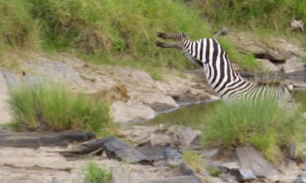Ωστόσο, η ζέβρα στάθηκε πιο έξυπνη και τυχερή. Έκανε ένα μεγάλο σάλτο, άλλαξε κατεύθυνση όταν κατάλαβε τον κίνδυνο κι άφησε τον Βασιλιά της ζούγκλας νηστικό.