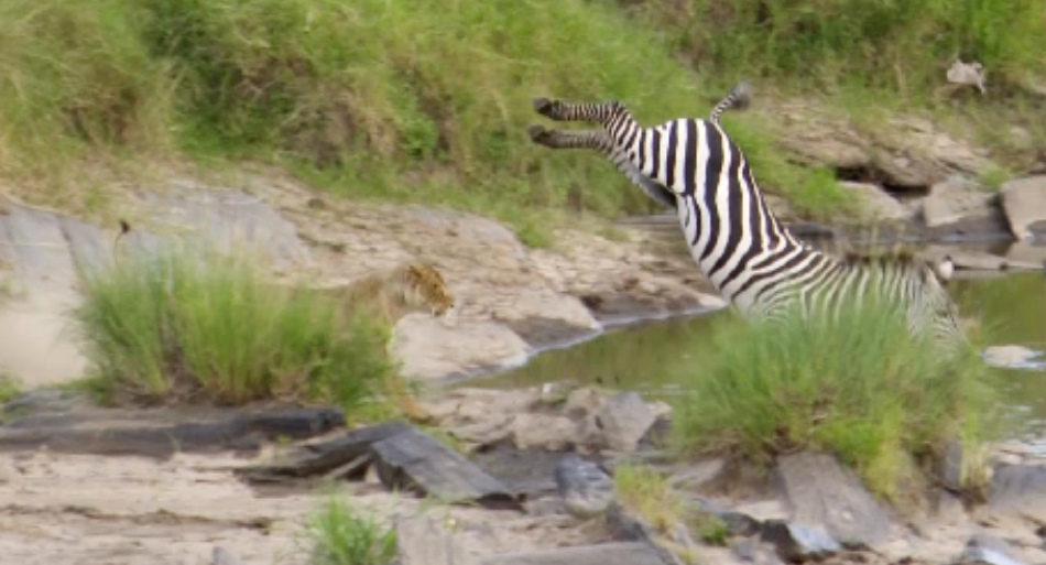 Ωστόσο, η ζέβρα στάθηκε πιο έξυπνη και τυχερή. Έκανε ένα μεγάλο σάλτο, άλλαξε κατεύθυνση όταν κατάλαβε τον κίνδυνο κι άφησε τον Βασιλιά της ζούγκλας νηστικό.