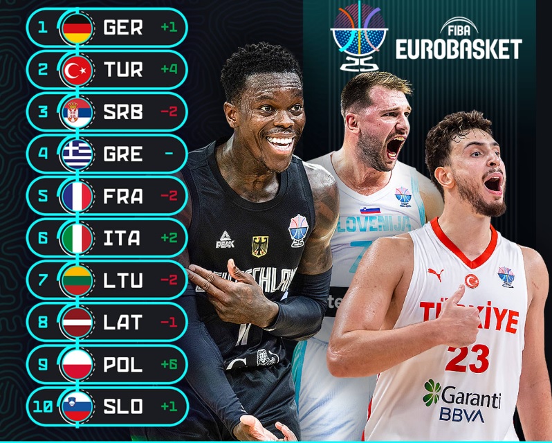 Στην κορυφή βρίσκεται η Γερμανία που έβλεπε την πλάτη της Σερβίας, ωστόσο οι γείτονες μας έπεσαν δύο θέσεις, αφού δεν κατάφεραν να νικήσουν την Τουρκία στο μεταξύ τους παιχνίδι για την πρώτη φάση του Ευρωμπάσκετ 2025.