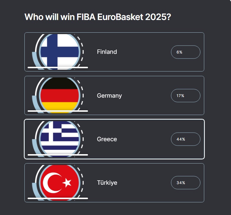 Μία μέρα πριν την διεξαγωγή των δύο ημιτελικών του Ευρωμπάσκετ 2025, που θα αναδείξουν το ζευγάρι του τελικού με φόντο το χρυσό μετάλλιο, η FIBA συνεχίζει την ψηφοφορία του κοινού για την Εθνική ομάδα που θα κατακτήσει την πρώτη θέση.