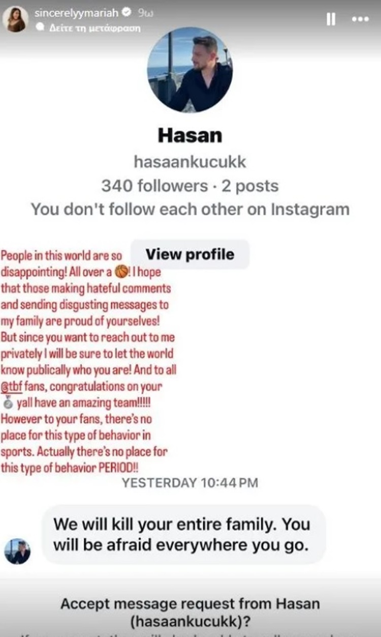 Η Μαράια δέχτηκε ένα προσωπικό μήνυμα στον επίσημο λογαριασμό της στο Instagram από Τούρκο οπαδό, ο οποίος απείλησε ανοικτά και άκρως απειλητικά την ίδια και την οικογένεια Αντετοκούνμπο.