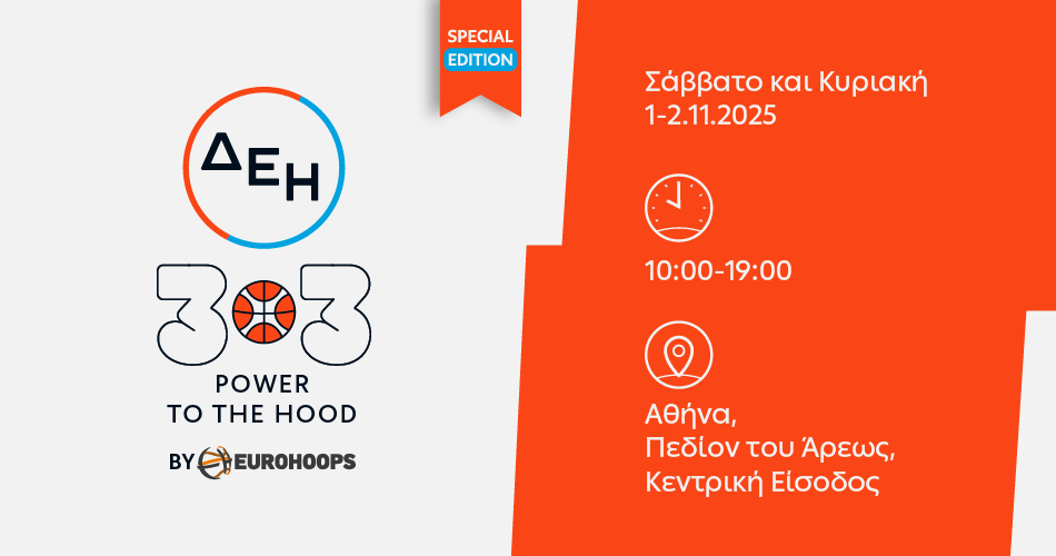 Το ΔΕΗ 3×3 POWER TO THE HOOD by Eurohoops, η μεγάλη μπασκετική γιορτή 3×3 για όλες και για όλους, ρίχνει αυλαία μετά από δύο χρόνια με ένα μοναδικό Special Edition διήμερο στο Πεδίον του Άρεως, στην καρδιά της Αθήνας, το Σαββατοκύριακο 1-2 Νοεμβρίου 2025. Το μεγαλύτερο πάρκο της Αθήνας θα μετατραπεί για δύο ημέρες σε ένα υπαίθριο μπασκετικό πολυχώρο, όπου μικροί και μεγάλοι θα έχουν την ευκαιρία να συμμετέχουν σε συναρπαστικούς αγώνες 3×3, καθώς και να διασκεδάσουν με παράλληλες ψυχαγωγικές δραστηριότητες εμπνευσμένες από το μπάσκετ που ξεκίνησε στις γειτονιές του κόσμου.