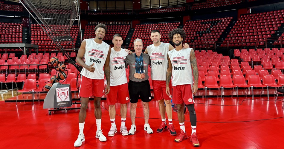 Οι τέσσερις “χάλκινοι” φωτογραφήθηκαν στο Στάδιο Ειρήνης και Φιλίας με τα μετάλλια τους από το Ευρωμπάσκετ και μαζί τους στο ενσταντανέ βρέθηκε ο γυμναστής του Ολυμπιακού και της Εθνικής, Ανδρέας Γκατζούλης, το παλιότερο μέλος των “ερυθρολεύκων”.
