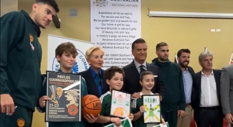 Η κυρία Δέσποινα Γιαννακοπούλου, ο πρόεδρος της ΚΑΕ Βασίλης Παρθενόπουλος, ο COΟ, Σταύρος Ντίνος και οι “χάλκινοι” του Ευρωμπάσκετ, Παναγιώτης Καλαϊτζάκης και Βασίλης Τολιόπουλος επισκέφτηκαν το ελληνορθόδοξο σχολείο της Νέας Νότιας Ουαλίας στο Σίδνεϊ, μοιράζοντας δώρα, αυτόγραφα και χαρά στους Έλληνες μαθητές.
