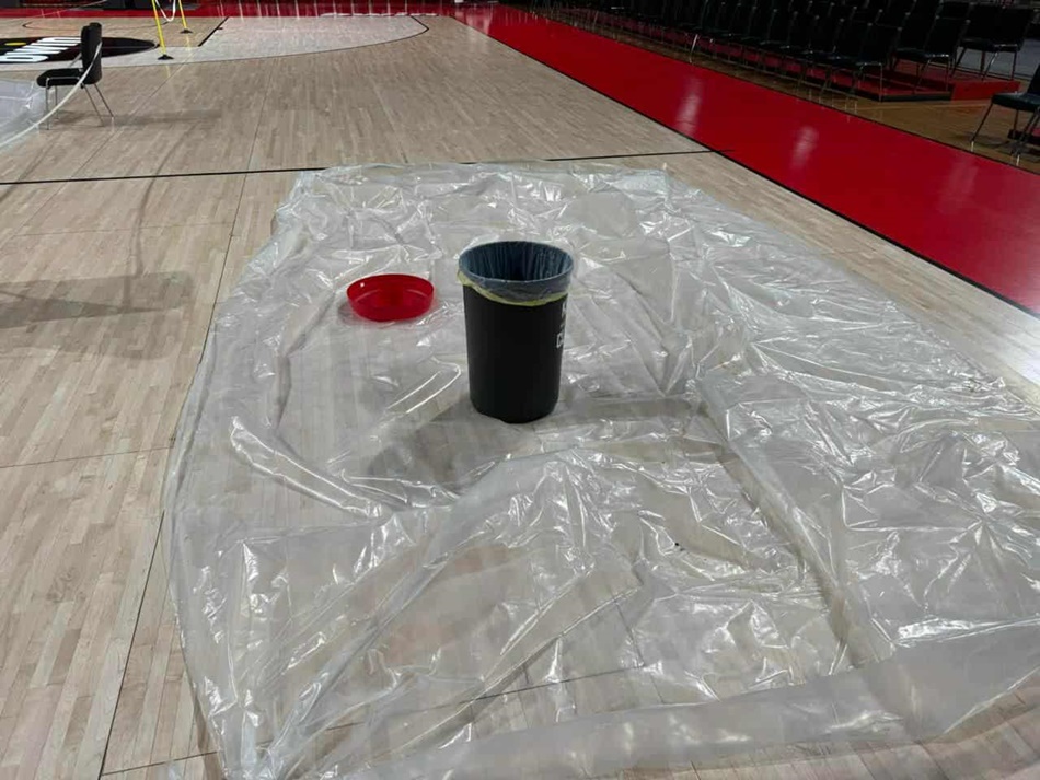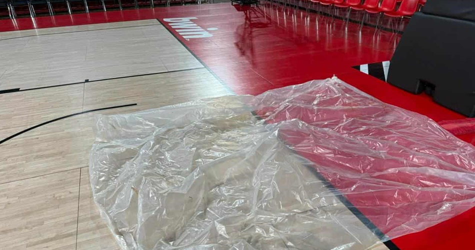 Με νάιλον και κουβάδες προσπαθούν οι “ερυθρόλευκοι” και οι υπεύθυνοι του σταδίου να προφυλάξουν το παρκέ, αλλά προφανώς η κατάσταση θα επιδεινωθεί αν συνεχιστεί η κακοκαιρία.