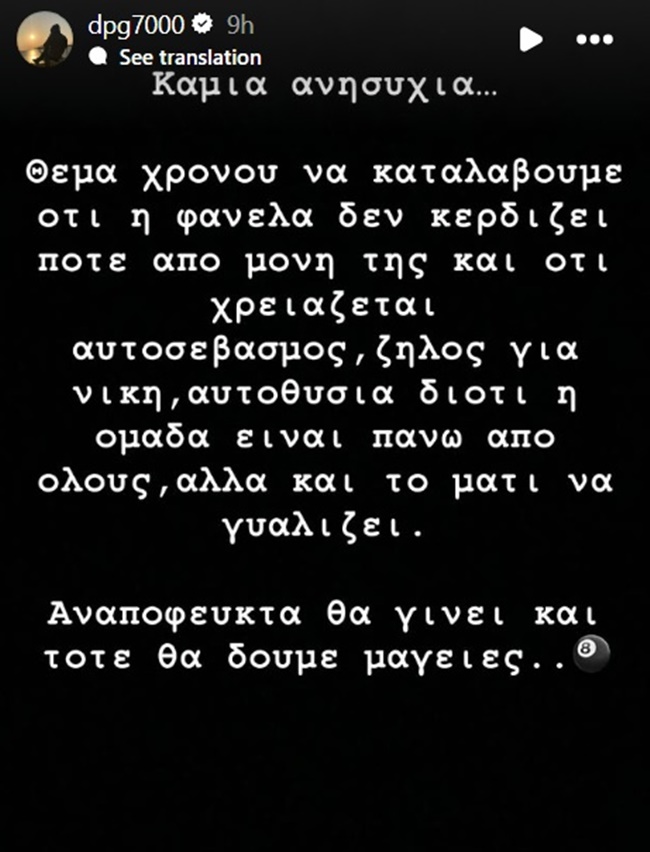 “Καμία ανησυχία. Θέμα χρόνου να καταλάβουμε ότι η φανέλα δεν κερδίζει ποτέ από μόνη της και ότι χρειάζεται αυτοσεβασμός, ζήλος για νίκη, αυτοθυσία. Διότι η ομάδα είναι πάνω από όλους, αλλά και το μάτι να γυαλίζει.