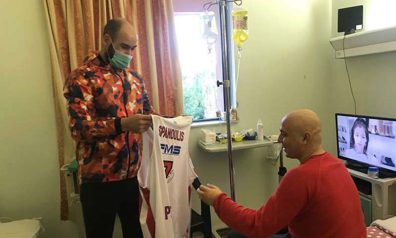 Ο V-Span του χάρισε μια φανέλα του, μια προπονητική μπλούζα και μια μπάλα με την υπογραφή όλων των παικτών της ομάδας μας. Από την πλευρά του, ο Αντώνης Λουκάδης -ο οποίος παρακολουθεί ανελλιπώς από την τηλεόραση όλα τα ματς των «ερυθρολεύκων»-, υποσχέθηκε στον αρχηγό πως στην αναμέτρηση με την Αναντολού Εφές θα βρίσκεται στο ΣΕΦ για να παρακολουθήσει δίπλα από τον πάγκο τον αγώνα και να στηρίξει την ομάδα μας!