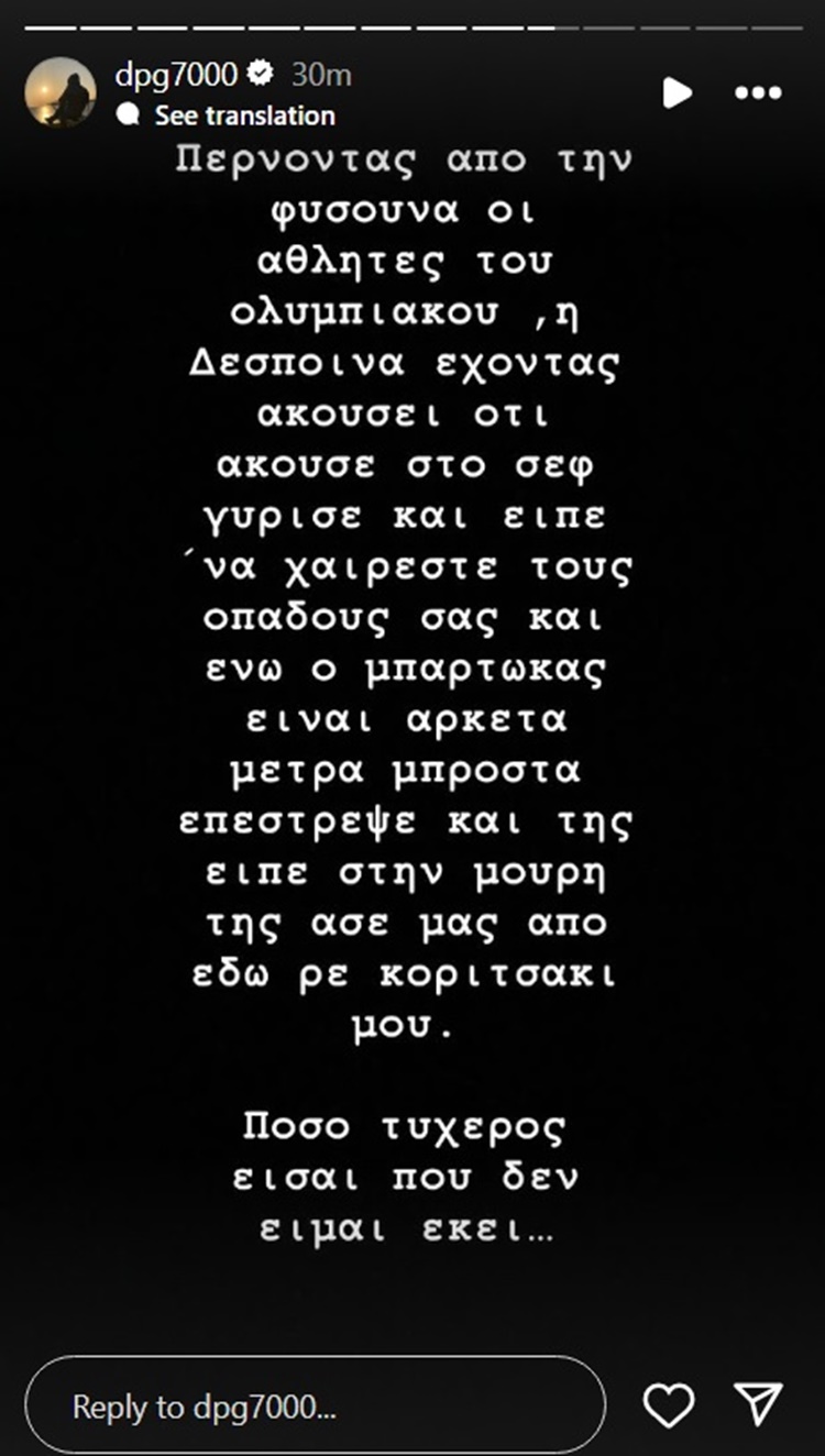 “Περνώντας από τη φυσούνα οι αθλητές του Ολυμπιακού, η Δέσποινα έχοντας ακούσει ότι άκουσε στο ΣΕΦ, γύρισε και είπε “να χαίρεστε τους οπαδούς σας”.