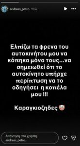 Η ανάρτηση του Πετρόπουλου με story στο Instagram, αναφέρει: «Ελπίζω τα φρένα του αυτοκινήτου μου να κόπηκαν μόνα τους… Να σημειωθεί ότι το αυτοκίνητο υπήρχε περίπτωση να το οδηγήσει η κοπέλα μου!!! Καραγκιόζηδες».