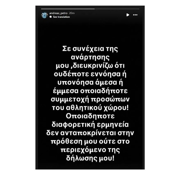 “Σε συνέχεια της ανάρτησης μου, διευκρινίζω ότι ουδέποτε εννόησα ή υπονόησα άμεσα ή έμμεσα οποιαδήποτε συμμετοχή προσώπων του αθλητικού χώρου! Οποιαδήποτε διαφορετική ερμηνεία δεν ανταποκρίνεται στην πρόθεσή μου ούτε στο περιεχόμενο της δήλωσής μου!”.
