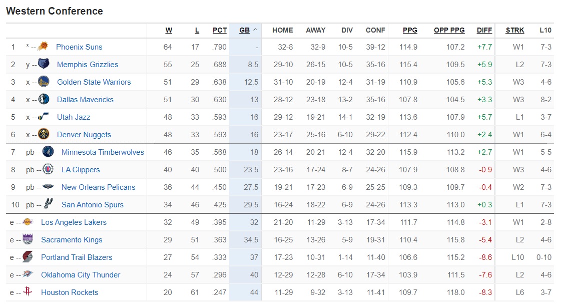 Οι Μαβς μπορούν να προσπεράσουν και τους Ουόριορς και να ανέβουν στην 3η θέση. Όλες οι υπόλοιπες θέσεις έχουν κριθεί στη Δύση.