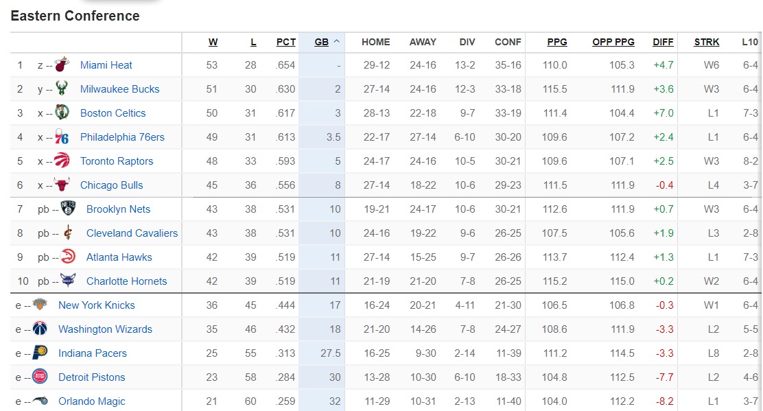Πιο κάτω, οι Ράπτορς φαίνεται πως θα μείνουν πέμπτοι και οι Μπουλς έκτοι, ενώ ανοικτά είναι τα πάντα από τις θέσεις 7-10, δηλαδή σε αυτές του “play-in” τουρνουά.