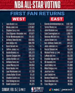 Στη Δύση, πίσω από τον Ντόντσιτς βρίσκονται οι Νίκολα Γιόκιτς (Νάγκετς, 1.128.962), Στεφ Κάρι (Ουόριορς, 1.031.455), Σέι Γκίλτζιους-Αλεξάντερ (Θάντερ, 878.621) και Βίκτορ Ουεμπανιάμα (Σπερς, 796.362).