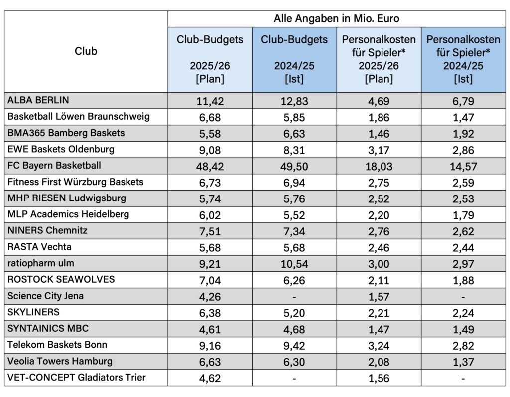 The season budgets of all 18 teams in the 2025-26 edition of Germany’s easyCredit BBL were revealed by the league on Friday.