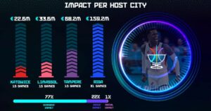 The study calculated the overall monetary impact rose to €283.6 million after adding up the economic, media and social impact and subtracting the environmental impact. The increase from €270 million in EuroBasket 2022 is significant, considering that edition was hosted in five cities (Berlin, Cologne, Milano, Prague and Tbilisi) with a much larger cumulative population.