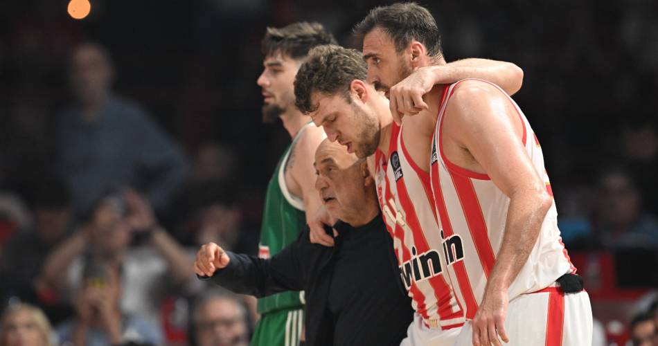 Sasha Vezenkov was helped off the court after a right ankle injury, with 1:13 remaining in the first half of a meeting between Olympiacos and Panathinaikos Aktor.