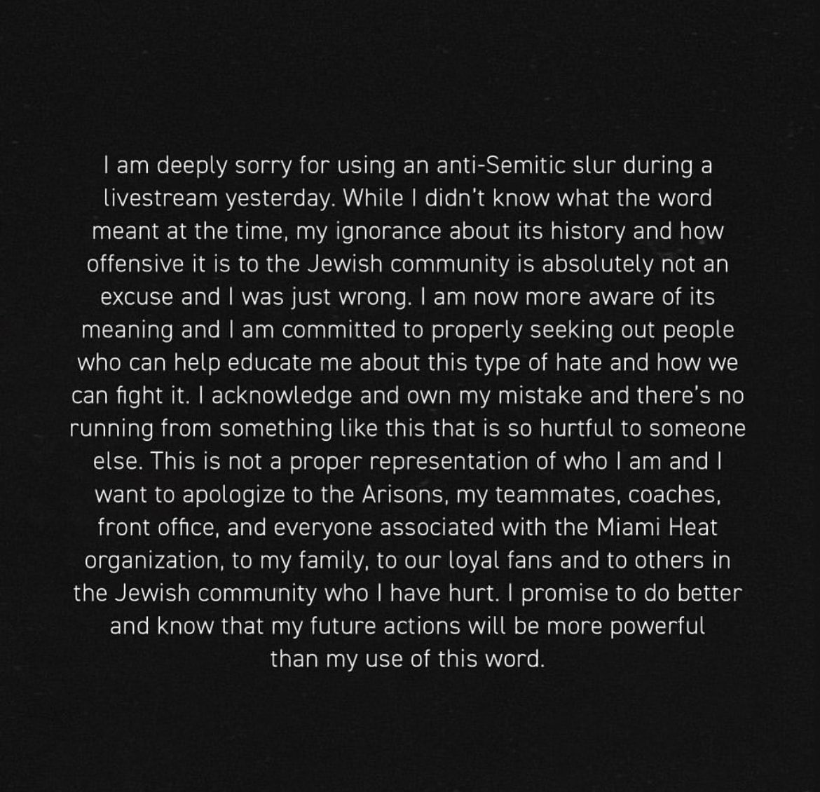 Pocas horas después, el propio jugador publica en su página de Instagram un texto en el que pedía disculpas por usar el término antisemita, al mismo tiempo que Origin PC, uno de sus patrocinadores, cancelaba su colaboración con el jugador.