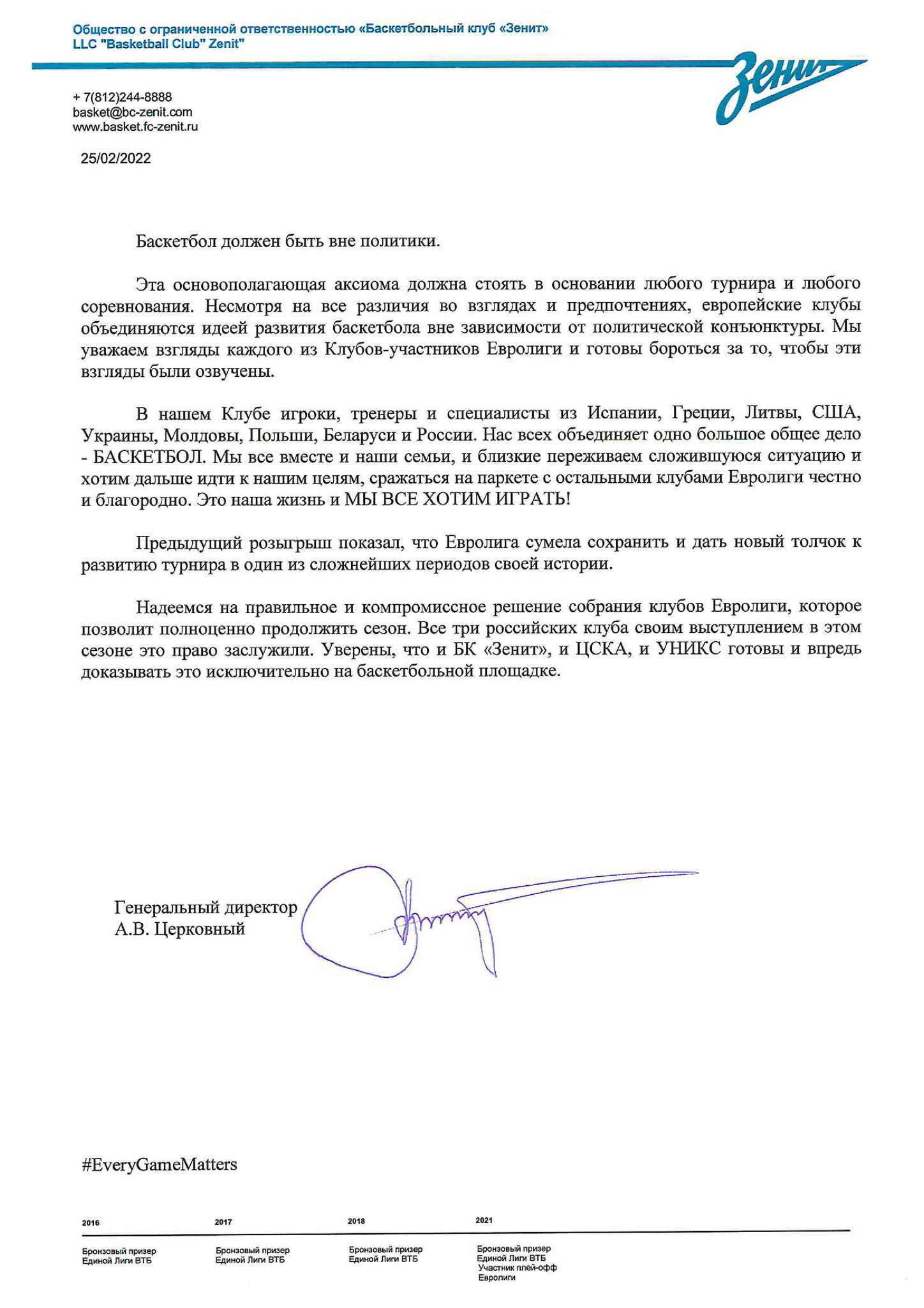 «Баскетбол должен быть вне политики», – говорится в заявлении Зенита.