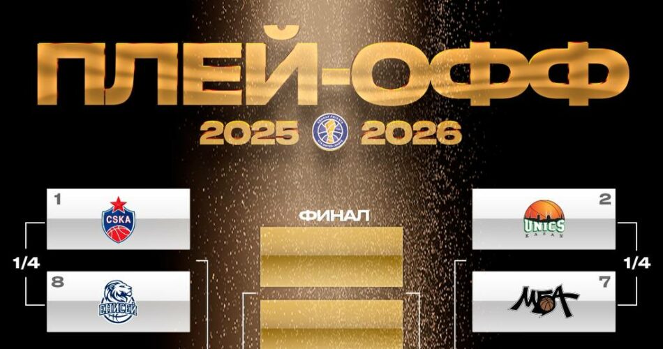В четвертьфиналах плей-офф Единой Лиги ВТБ сезона-2025/26 в сериях до трех побед (по схеме 2-2-1) встретятся ЦСКА – Енисей, УНИКС – МБА-МАИ, Зенит – Уралмаш и Локомотив-Кубань – БЕТСИТИ ПАРМА. Матчи начинаются на площадке команды, занявшей более высокое место по итогам регулярного сезона.