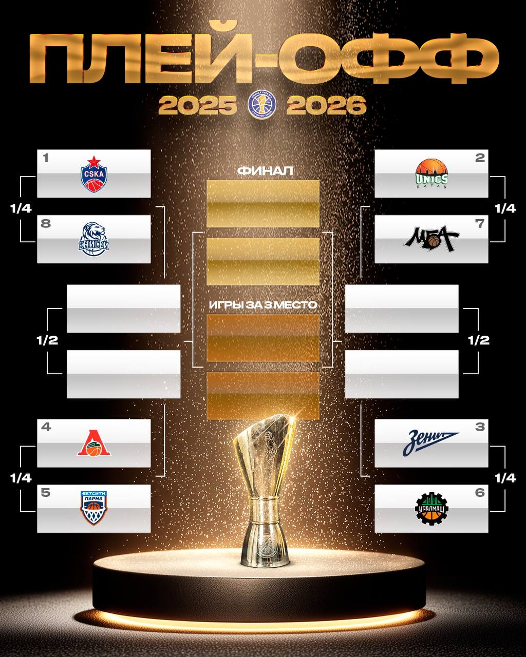В четвертьфиналах плей-офф Единой Лиги ВТБ сезона-2025/26 в сериях до трех побед (по схеме 2-2-1) встретятся ЦСКА – Енисей, УНИКС – МБА-МАИ, Зенит – Уралмаш и Локомотив-Кубань – БЕТСИТИ ПАРМА. Матчи начинаются на площадке команды, занявшей более высокое место по итогам регулярного сезона.