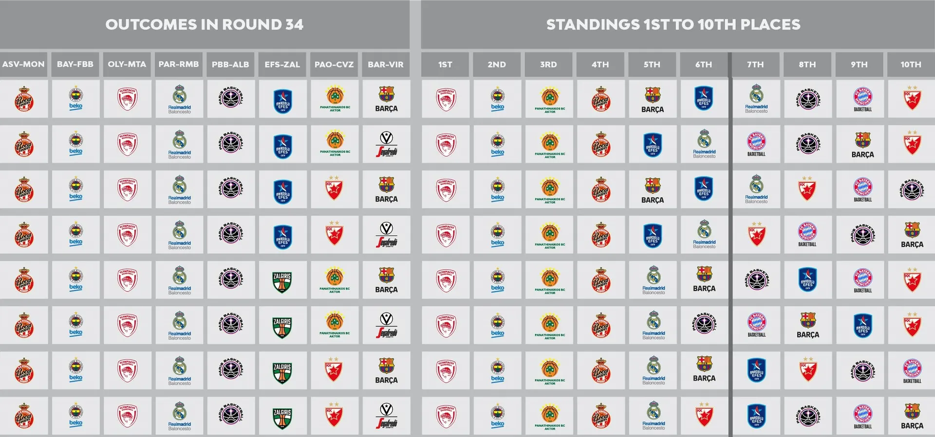 Olimpiakos normal sezonu lider tamamladı. Fenerbahçe Beko ikinci sırada, Panathinaikos ise son maçının sonucundan bağımsız olarak sezonu üçüncü sırada tamamlayacak. AS Monaco ise dördüncü sıraya yerleşmiş vaziyette.