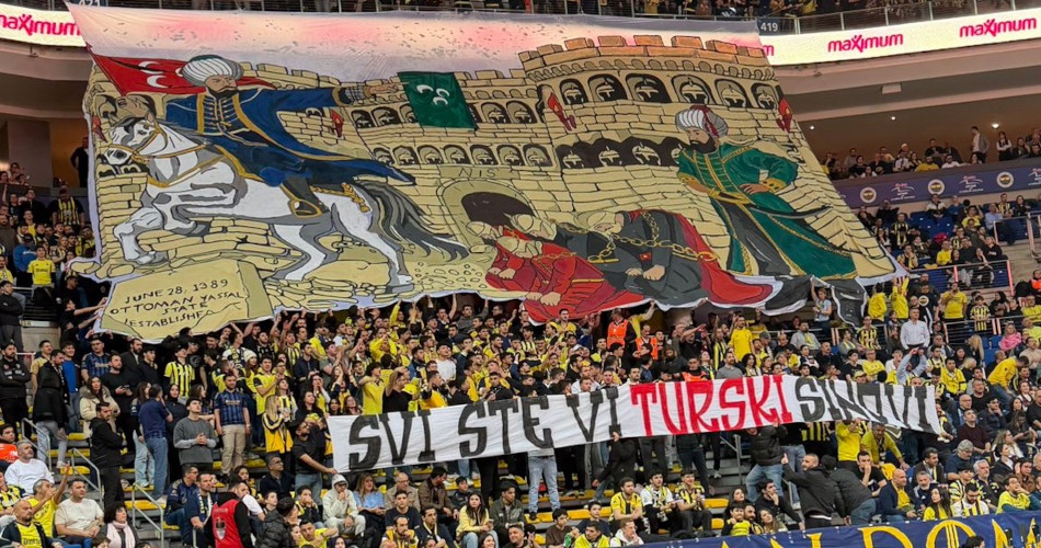 İlk maçta Partizan tribünlerinde açılan çirkin pankartın ardından Fenerbahçe taraftarı, buna cevap niteliğinde pota arkasında bir pankart açmıştı.