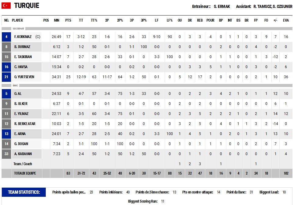 Takımımızda 34 dakika oyunda kalan Ömer Faruk Yurtseven 25 sayı, 17 ribaund, 36 verimlilik puanıyla maça damga vuran isimdi.