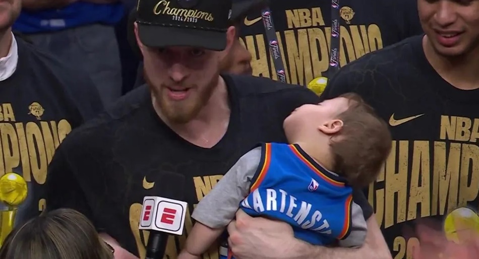 27 yaşındaki Hartenstein’ın oğlu Elijah, 2025 NBA Finalleri’nin 7. maçını 18.000 kişilik Paycom Center’daki coşkulu atmosferde izlerken yoruldu ve maç sonunda babasının kucağında uyuyakaldı. Takımın şampiyonluk kupasını almak üzere orta sahadaki sahneye çıktığı anlarda Elijah hâlâ babasının kollarında derin uykudaydı. O salondaki genel heyecanın aksine sahnede sakinlik ve huzur simgesi oldu.