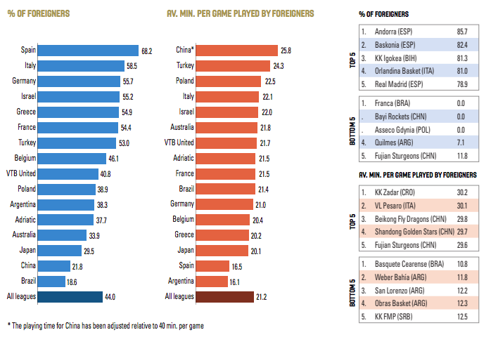 Dünyada yabancı oyunculara ortalama olarak en fazla süre veren takım 30.2 dakikayla Zadar olurken takımdaki yabancı oyuncu ortalaması en yüksek olan takım ise %85.8 ile Andorra oldu.
