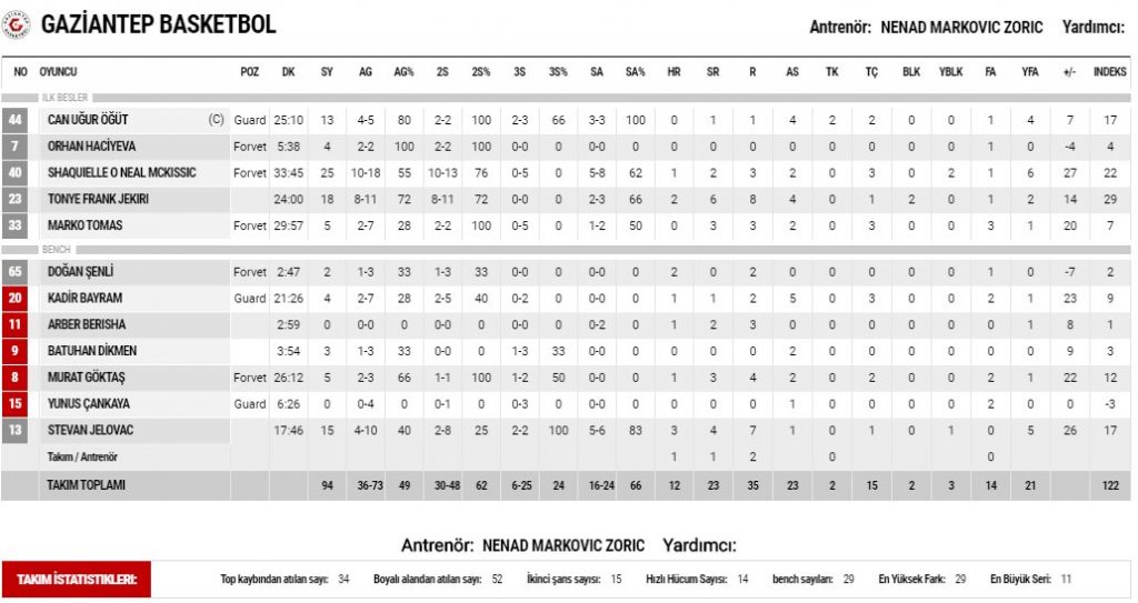 McKissic 25 sayıyla Gaziantep’e galibiyeti getiren en skorer isim olurken Jekiri 18 sayı, 8 ribaunt, 4 asist, 1 top çalmayla her işi yapan uzun rolünde yıldızlaştı. Can Uğur Öğüt 13, Jelovac 15 sayı ekledi.