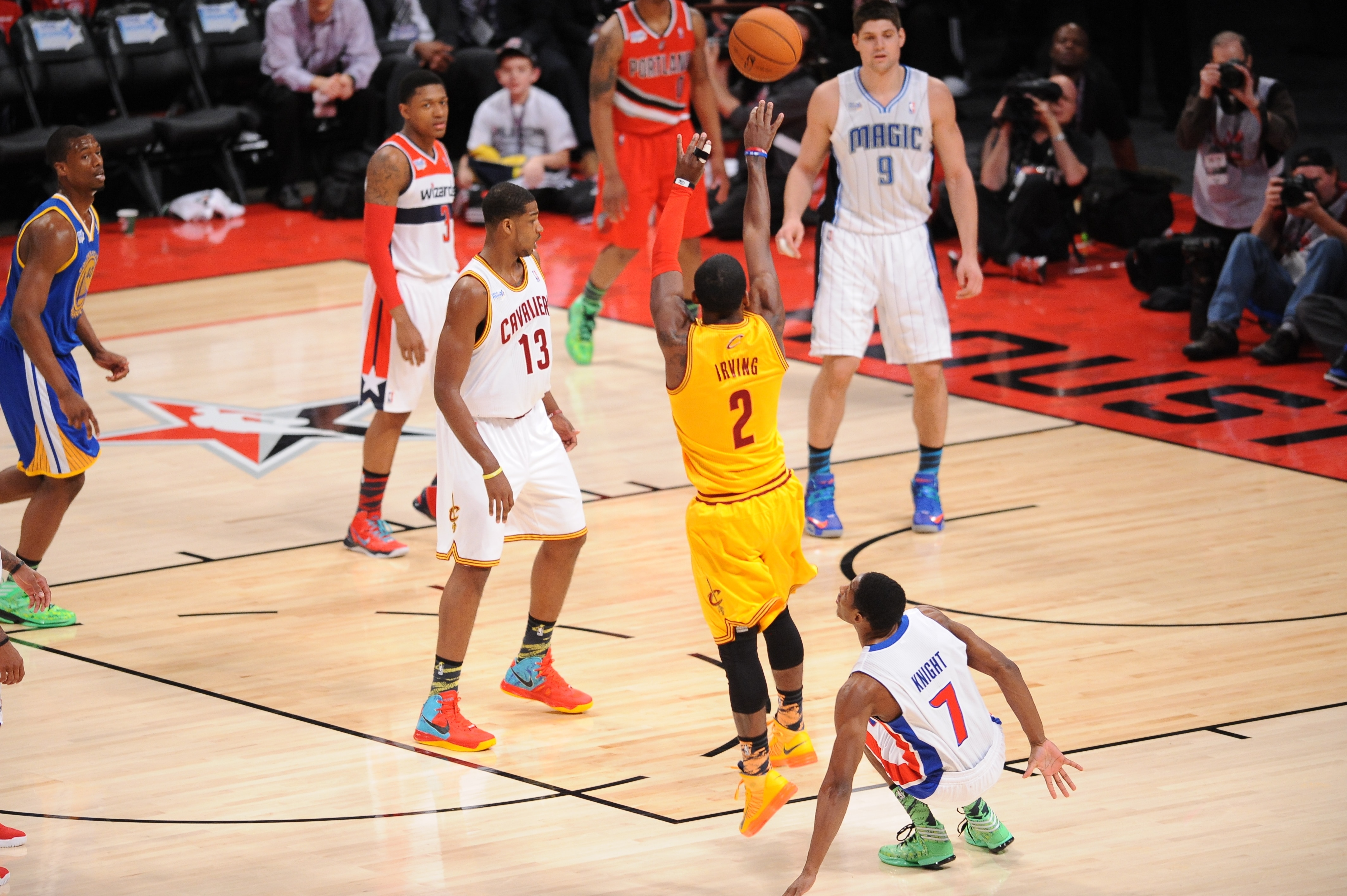 All-Star Hafta Sonları; alley-oop’lar, artistik turnikeler ve göz alıcı hareketlerle insanların kafasında yer etmiştir. Bu yüzden Irving’in bu hareketi, All-Star hafta sonu tarihindeki yerini çoktan aldı bile. Knight, bu pozisyonda Irving’e iyi bir savunma yapmak istiyor. Ancak Irving, yaptığı el crossover üstüne geriye çekilerek attığı şut ile bunun neden kötü bir fikir olduğunu hemen gösteriyor.