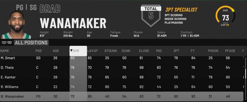Fenerbahçe‘nin 2018 yazında NBA’e yolladığı ve Boston Celtics formasıyla iki sezondur NBA’de oynayan Brad Wanamaker, oyunun bir önceki sürümü ile aynı rating’i alarak yeni sezona başlıyor.